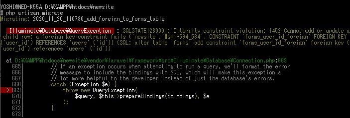 laravelですでに作成済みのテーブルに対して、マイグレーションファイルを使って、foreign_key(外部キー)を追加しようと試みた際、以下のようなエラーが出てハマってませんか?