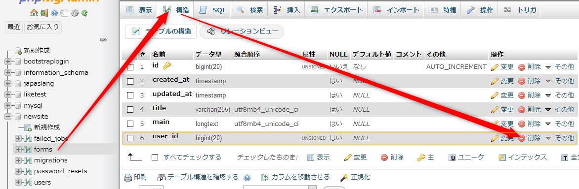 なので、phpMyAdminにログインし、作られてしまったuser_idカラムを手動で削除しましょう。