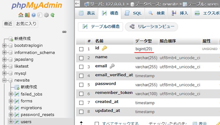 phpMyAdminから見ると、bigintとなってますね。