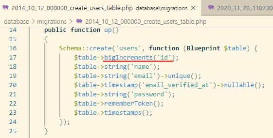 例えば、usersテーブルを作成したマイグレーションファイルを開いてみると、