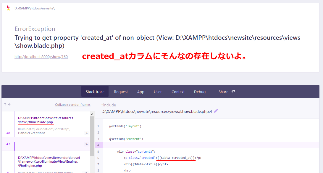 コントローラーでid番号を探すクエリを出したのに、エラー画面では、ブレードで読み出し指定した{{ $data->created_at }}部分でエラーってるよと出てしまいます。