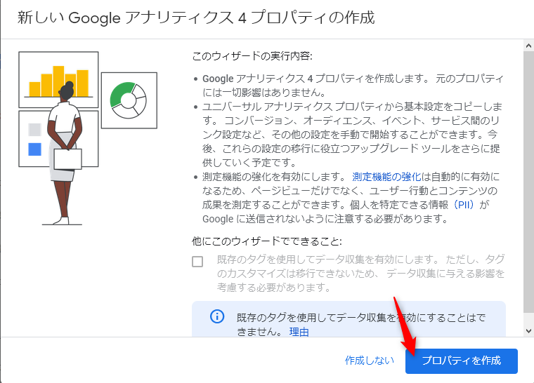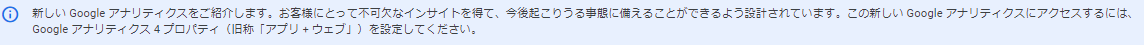 この新しい Google アナリティクスにアクセスするには、Google アナリティクス 4 プロパティ (旧称 「アプリ + ウェブ」)を設定してください。