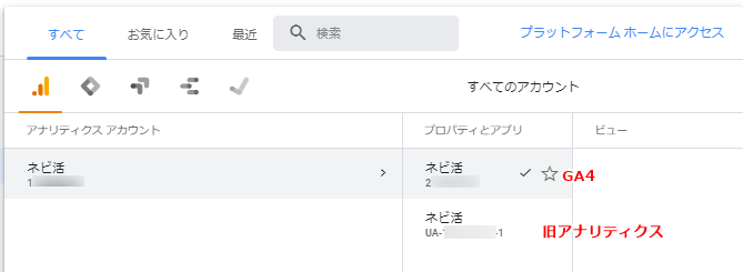 アナリティクス画面左上のすべてのアカウントの所をクリックすると、