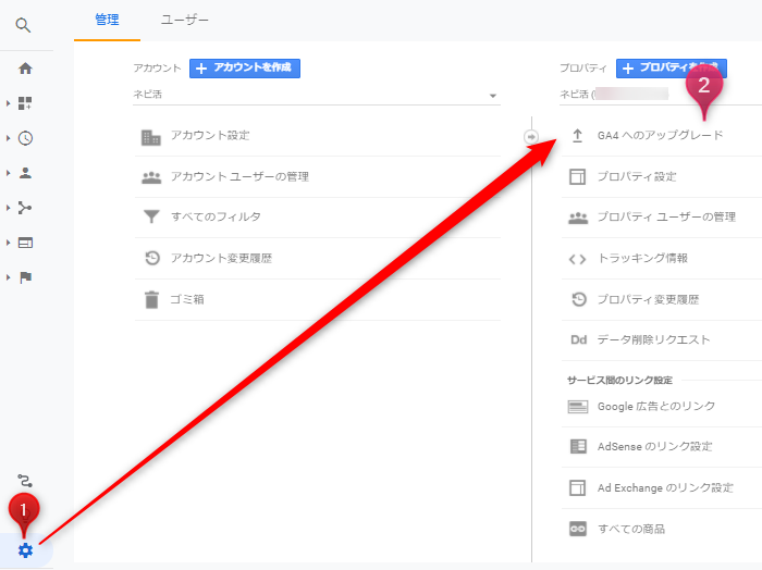 まず、管理画面を開き、GA4へのアップグレードを開きます。