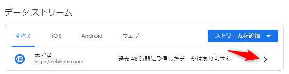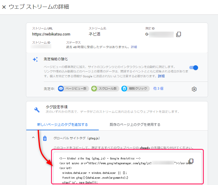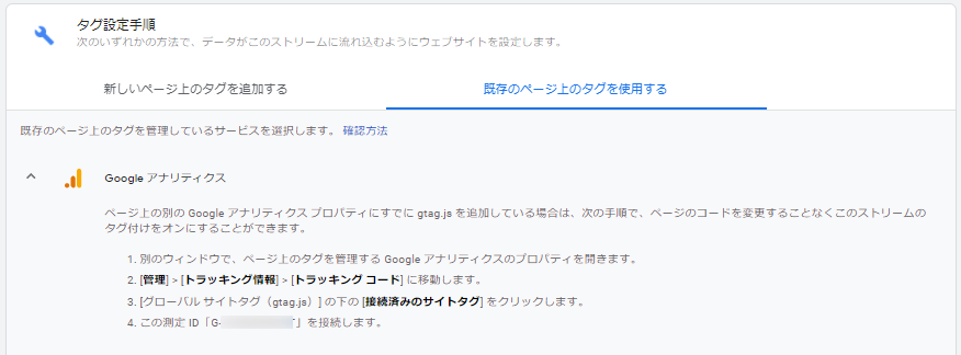 で、先程のウェブストリームの画面で「既存のページ上のタグを使用する」ってオプションがありますよね↓