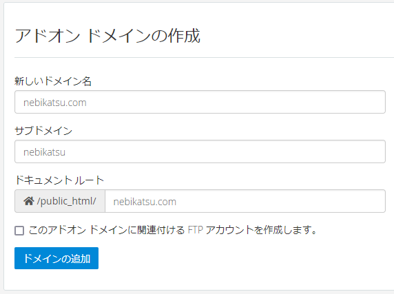 上記のような感じに入力して、ドメイン追加を押せば、public_html配下に、ドメインが作成されます。