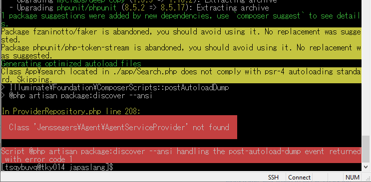 その場合、ネット検索して、必要なパッケージをインストールし直すと大抵直ります。上の画像なら、Jenssegersというパッケージが足りなかったので、Jenssegersの公式へ行き、そこに書かれたインストールコマンド