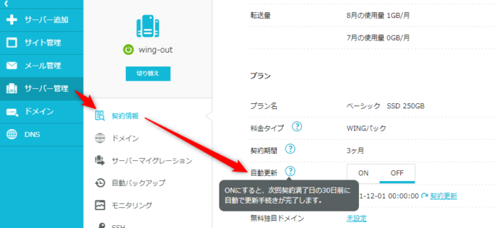 画像のように、サーバー管理→契約情報から自動更新はOFFにできます。