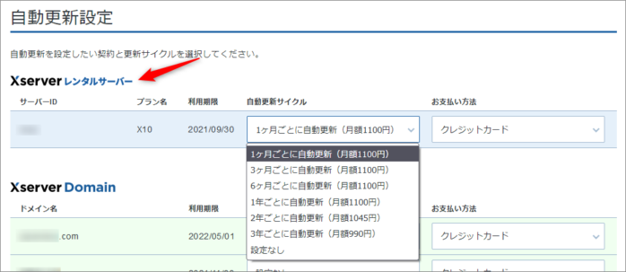 Xサーバーの場合は、次の契約の時に、「クレジットカードでの毎月自動更新払い」に変更する事ができます。