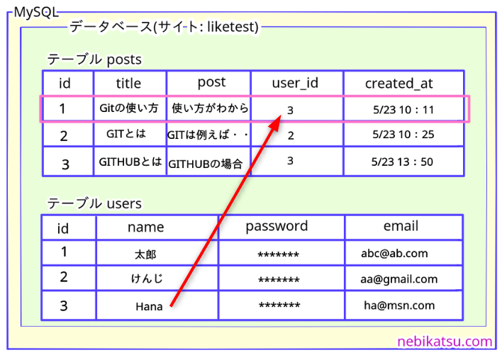 Laravelで、データベースからデータを出す時に、他のテーブルの関連情報も取り出したいんだけど、やり方が分からない・・ 例えば、こん...