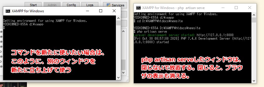 ここでは、php artisan serve というコマンドを使って、PC(XAMPP)上で作ったLaravelサイトを、ブラウザで実際に表...